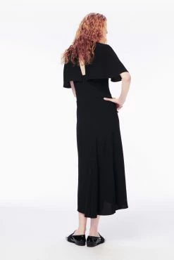 The Victoria Beckham Keyhole Detail V Neck Midi Dress in black. Cut outs and peekaboo details are a VB signature, and this Keyhole Detail V Neck Midi Dress is an effortless style for day or night. A deep V neckline and cut out shoulders bring a light, open feel that’s key for Pre Spring Summer 2022, while a draped sleeve, summer sable fabrication and fit-and-flare shape lend ease of movement.