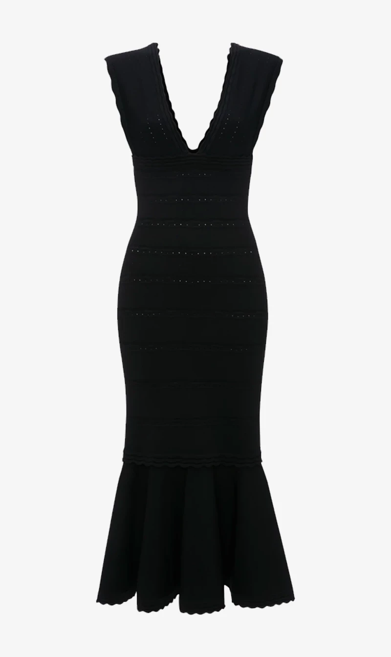 Reimagined in crisp timeless black, the knit Sleeveless Flared Dress is an effortlessly chic option for spring summer. With a fit-and-flare silhouette, horizontal seam detailing from empire line to knee and deep V-neck to the front and back, it encapsulates modern femininity.
