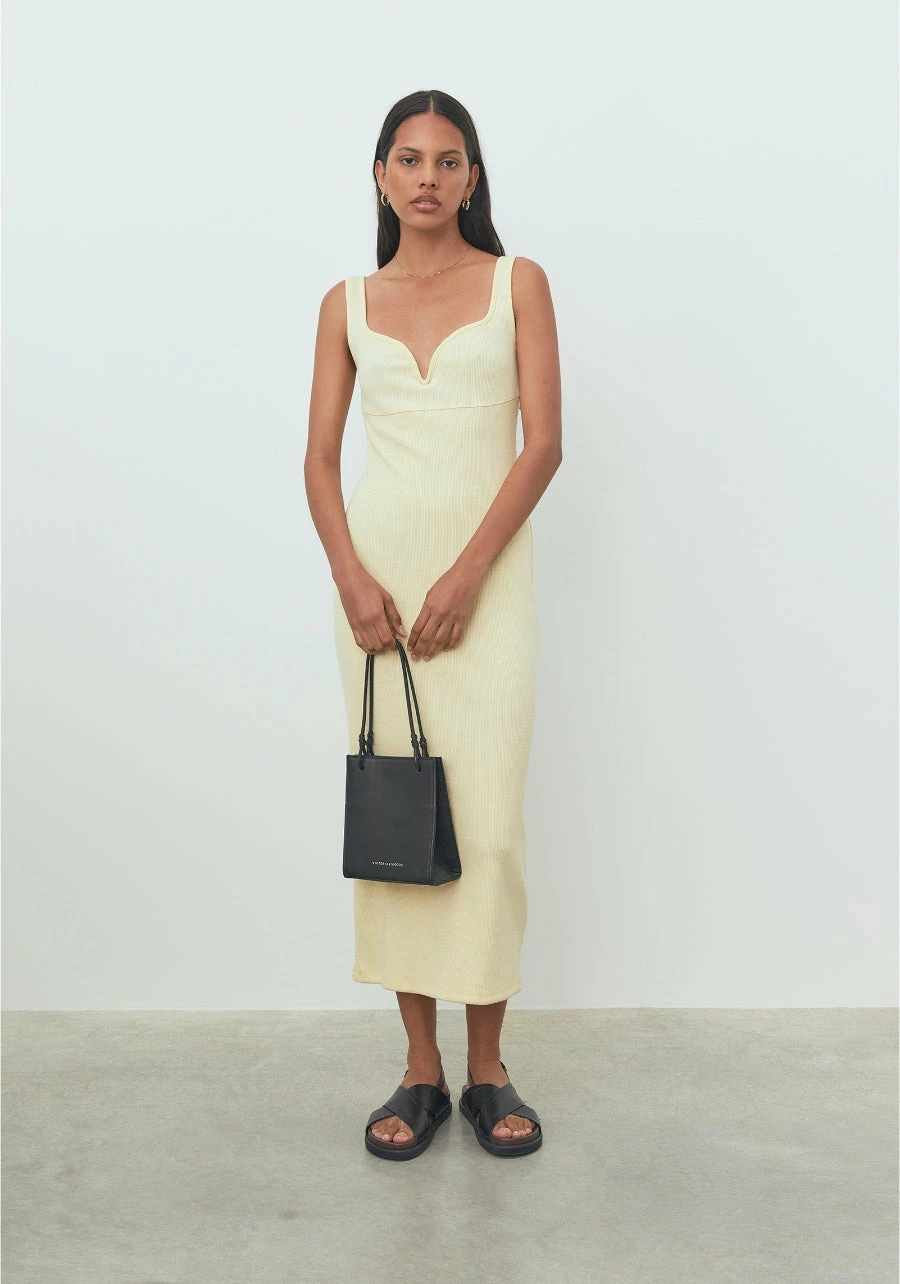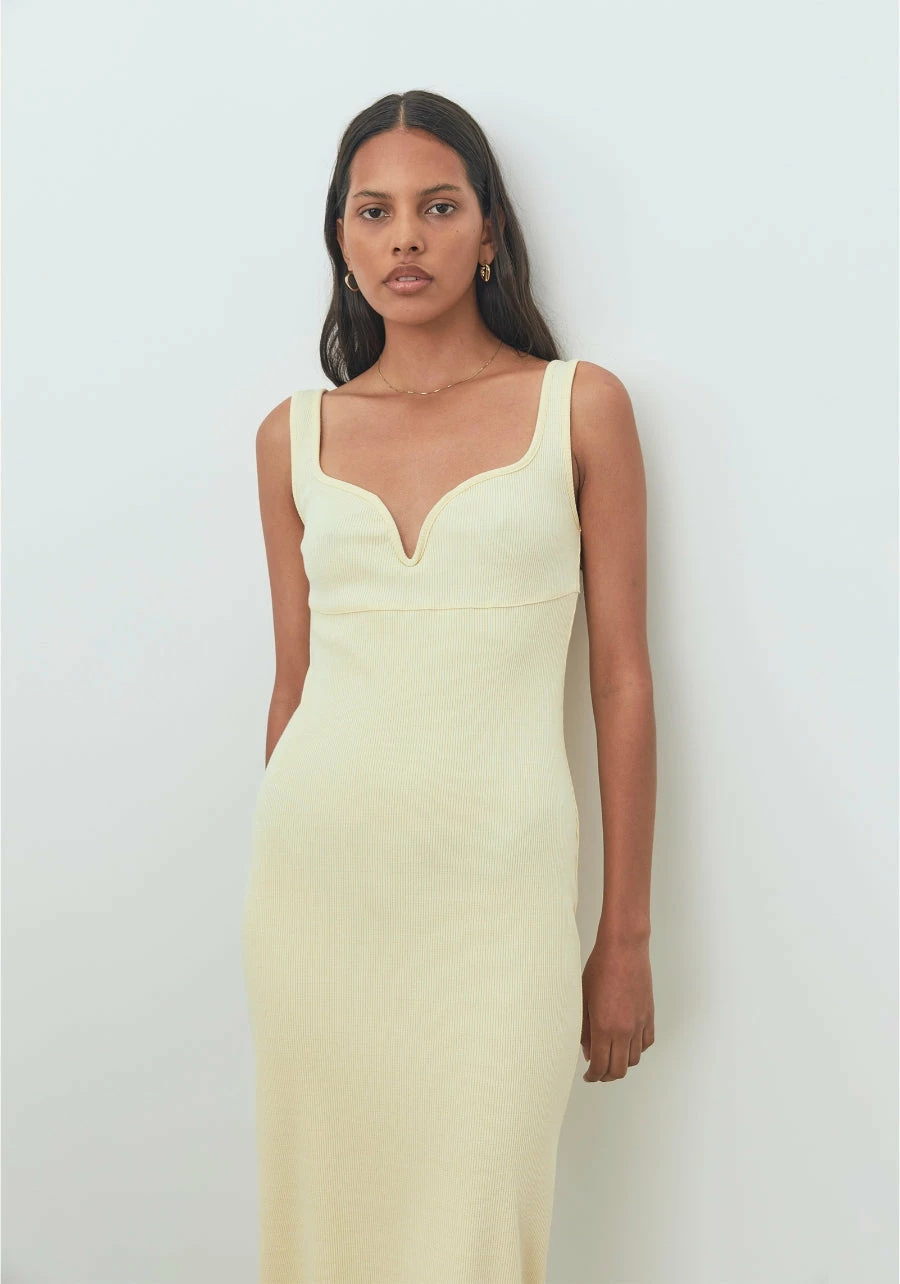 The Viktoria & Woods Margarita Dress in Lemon Marle is a refreshing look for warm weather styling. Crafted in a marled rib, this midi dress is designed to hug the figure and cuts to a plunging neckline with added wire for structure. Pair with flats and sunglasses for an on-the-go look in summer.
