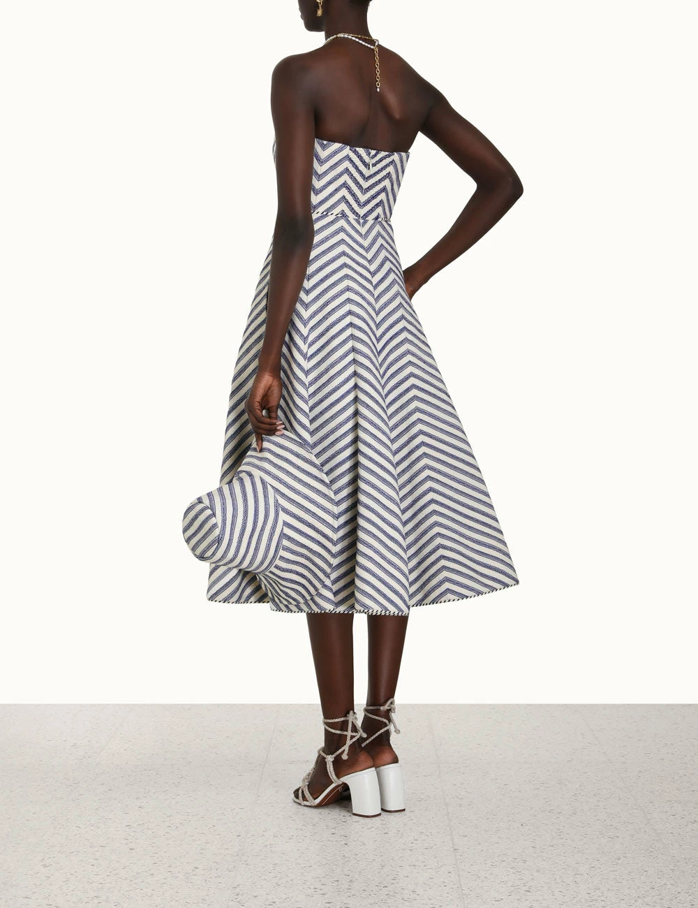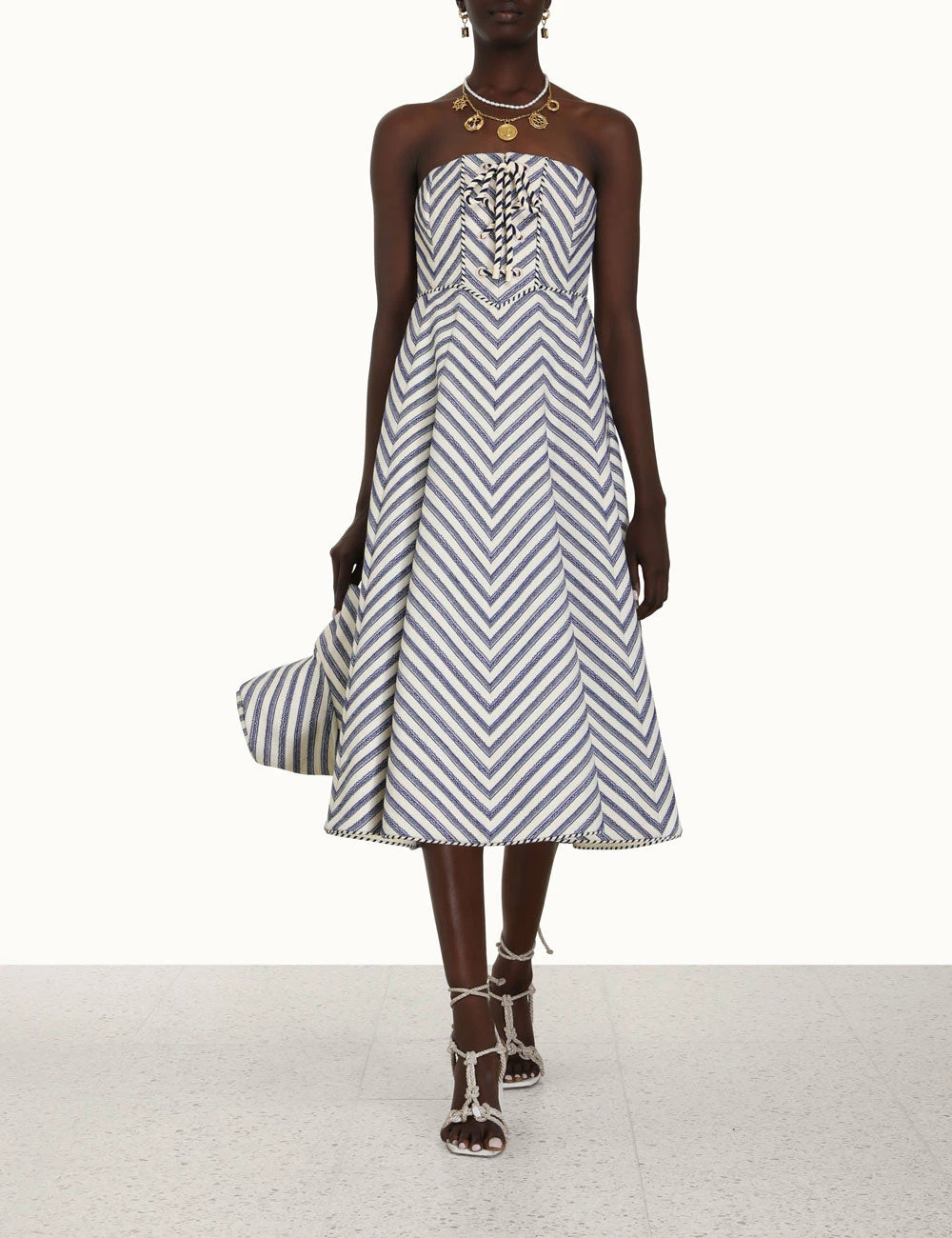 The High Tide Laced Midi Dress by Zimmermann in Navy/Cream Stripe comes from the brands acclaimed Resort 2023 Collection, High Tide. A stripe jacquard midi dress featuring a rope detailed bodice, strapless neckline and side seam pockets, finished with a crinoline tape hem and boning throughout. Pair with a strappy summer heel for polished perfection.