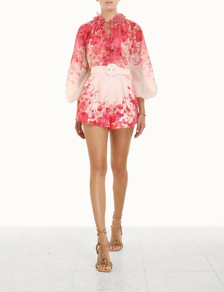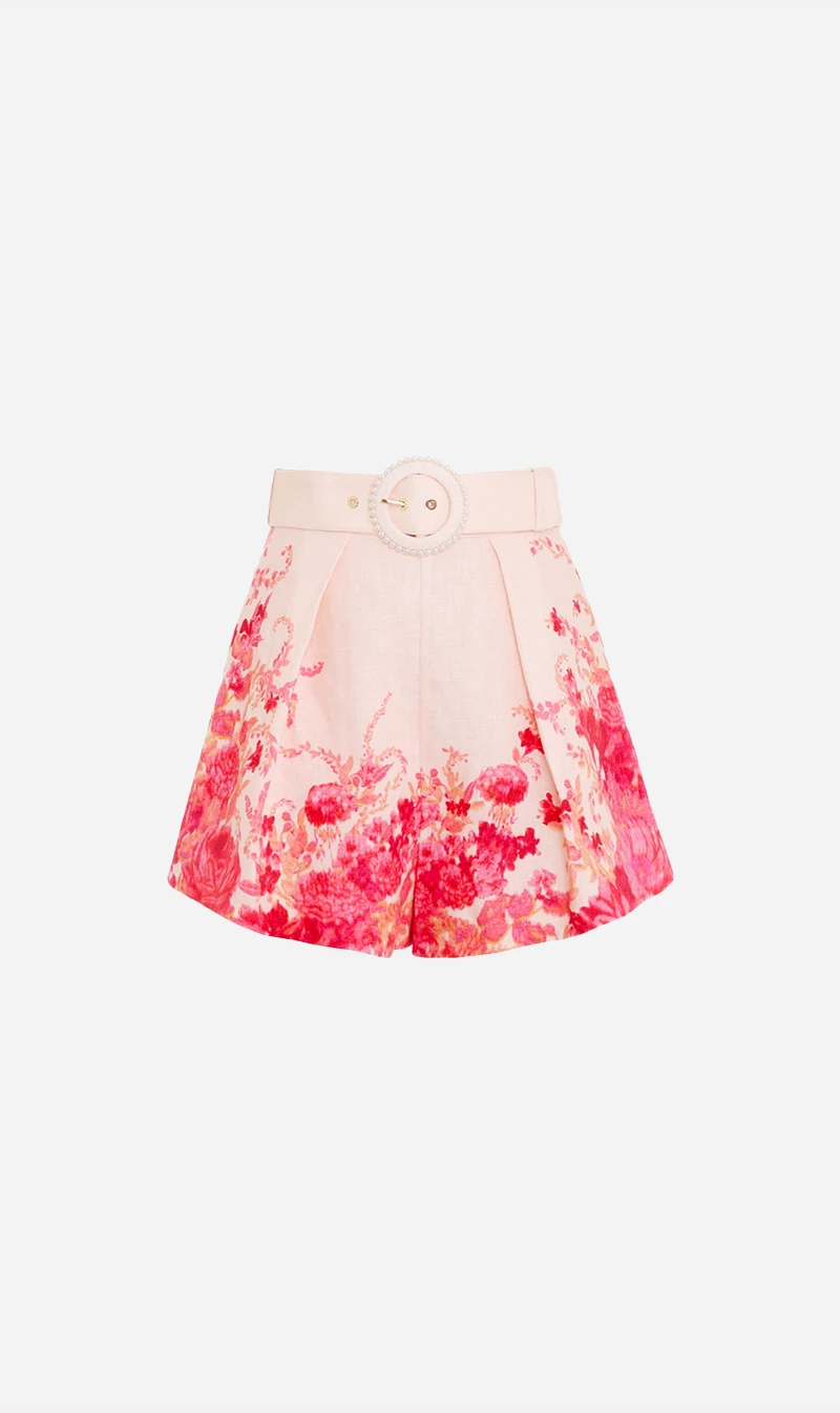 The High Tide Tuck Short in Pink Ikat Floral by Zimmermann comes from the brands coveted Resort 2023 Collection, High Tide. High-waisted linen short featuring tucks from the waistband, side seam pockets and a self-cover buckle belt, pair with a simple white tank and off-white slide for refined summer dressing.