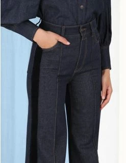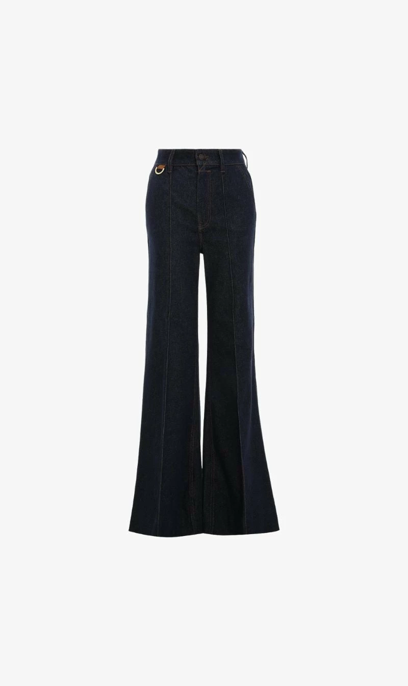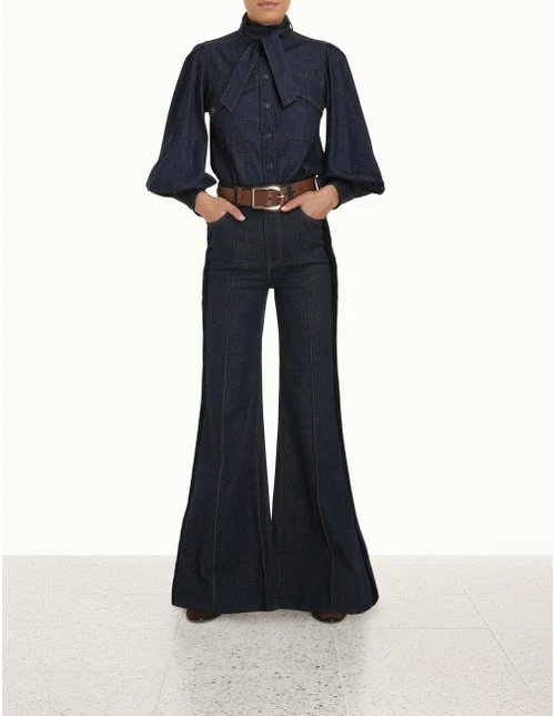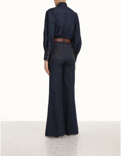 The Kaleidoscope Jean in Ink from Zimmermann has a super flared silhouette with a high waist with a panelled design.Â