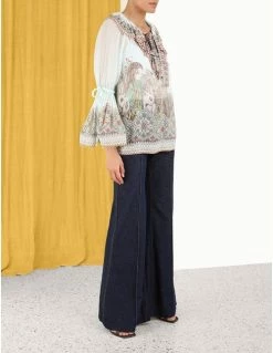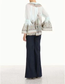 The Kaleidoscope Ruffle Blouse by Zimmermann in Capricorn Zodiac Print from our Fall 2022 Collection, Stargazer. The Kaleidoscope Ruffle Blouse featuring a ruffled neckline with bell sleeves, finished with beaded trims.
