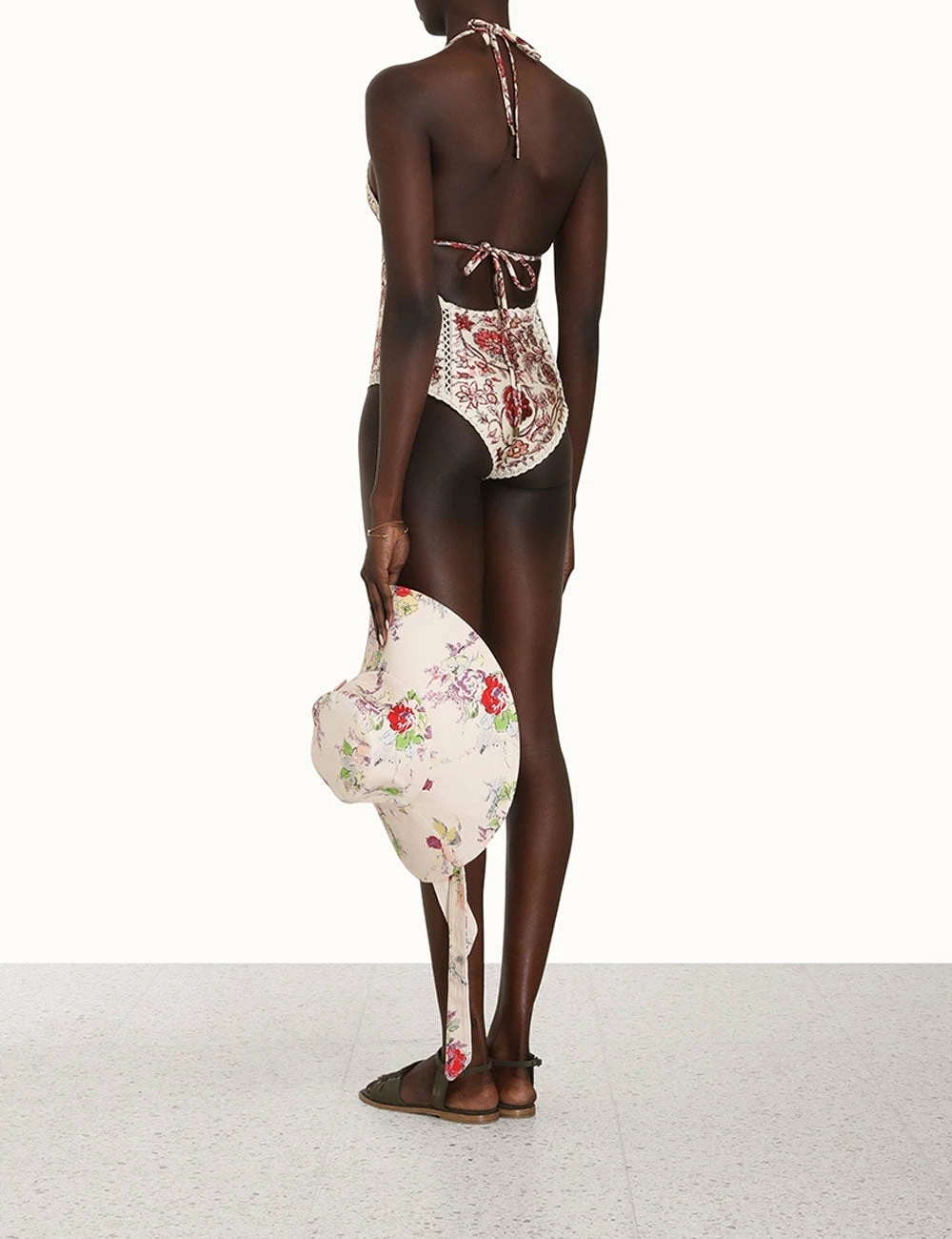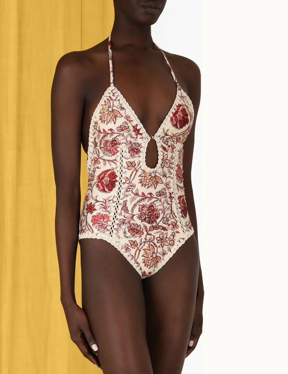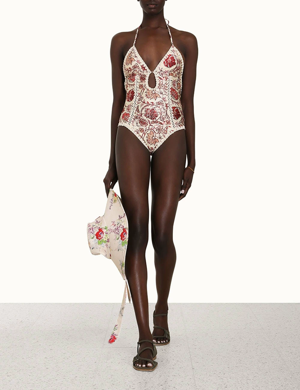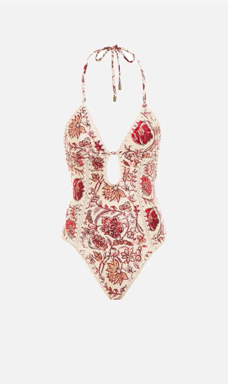 The Vitali Keyhole Crochet 1PC in Sepia Floral by Zimmermann is from the brands acclaimed Resort Swim 2023 Collection. An Italian lycra one piece featuring a plunging V-neckline, keyhole cut out and crochet edging throughout.